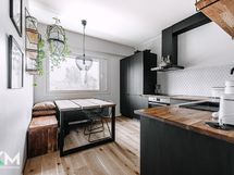 - Kaapistot, jääkaappi/pakastin, erillisuuni- ja induktioliesitaso, liesituuletin/ aktiivihiilisuodatin, astianpesukone, mikroaaltouuni. Kaikki kodinkoneet on integroitu ja keittiö on täysin remontoitu vuonna 2022.