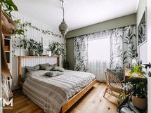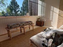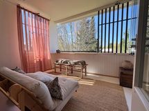- lasitettu, Olohuoneesta kulku tilavalle lasitetulle parvekkeelle.. Parvekkeen suunta: länsi