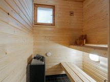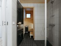 - Sauna, sähkökiuas, kylpyhuone, suihku, suihkuseinä, peilikaappi, pesukoneliitäntä, lattialämmitys Kph, kiinteät valaisimet.