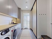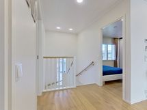 Sisääntulokerroksessa on valoisa ja avara olohuone, laadukkaasti varusteltu keittiö integroiduilla Boschin kodinkoneilla. Keittiöstä on käynti lasitetulle tilavalle terassille. Alakerrassa on kylpyhuonetilat saunalla ja kodinhoitotilat omalla sisäänkäynnillä sekä erillinen wc. Yläkerrassa sijaitsevat kolme makuuhuonetta, iso toinen arkiolohuonetila (joka toimii tarvittaessa myös neljäntenä makuuhuoneena) ja toinen kylpyhuone sekä parveke.