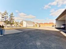 Siisti valmiiksi tehty asfaltoitu ajopiha ja laatoitettu sisäänkäynnin edusta. Valmiit nurmialueet istutuksin.