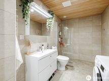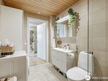 Varustus: suihkuseinä, pesukoneliitäntä, lattialämmitys, wc-istuin, peilikaappi, kiinteät valaisimet, kylpyhuonekaapisto.