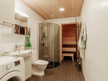 - Sauna, sähkökiuas, suihku, suihkuseinä, peilikaappi, allaskaappi, pesukoneliitäntä, kiinteät valaisimet.