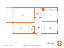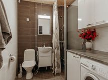 - Suihku, suihkuseinä, peilikaappi, kaapit, allaskaappi, pesukoneliitäntä, lattialämmitys Sähköllä., kiinteät valaisimet. Pesuhuoneessa lämmitysputki vuotanut v. 2019, korjauksen yhteydessä pesuhuone on saneerattu/ laatoitettu ja asennettu lattialämmitys.