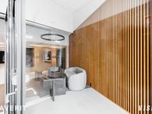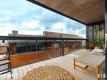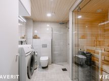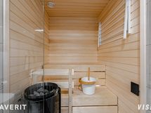 Asunnon muuta värimaailmaa mukailevassa keittiössä runsaasti lasku- ja säilytystilaa sekä integroidut kodinkoneet. Olohuoneesta käynti suurelle lasitetulle parvekkeelle. Olohuoneen yhteydessä oleva makuuhuone on erotettu muusta tilasta näyttävällä lasiseinällä. Päämakuuhuoneessa runsaat kaapistot liukuovilla. Tyylikäs valkoharmaa kylpyhuone, jossa seinä-wc ja paikka pesutornille. Saunan erottaa kylpyhuoneesta kirkas lasiseinä.