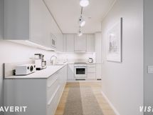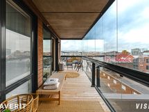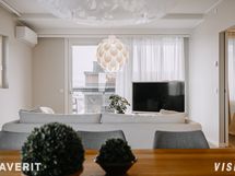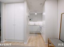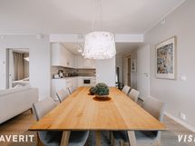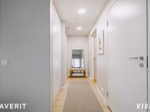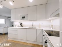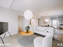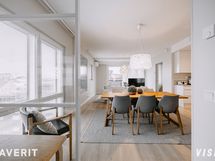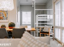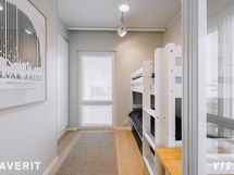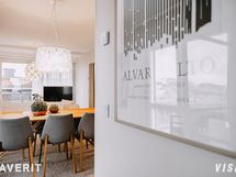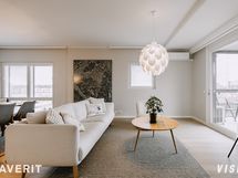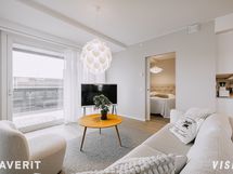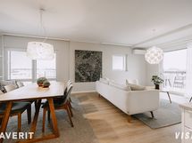 Asuntoon valitut rauhallisen tyylikkäät pintamateriaalit, yhdessä suurten eri ilmansuuntiin aukeavien ikkunoiden kanssa antavat asunnolle raikkaan ja kodikkaan ilmeen. Nykyaikainen pohjaratkaisu, jossa keittiö, ruokailutila sekä olohuone ovat yhtä avaraa tilaa.