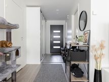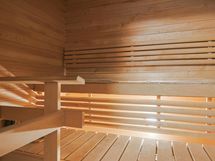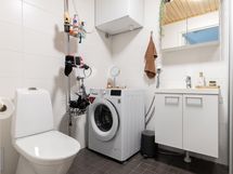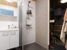 Sauna, sähkökiuas, kylpyhuone, suihku, peilit, peilikaappi, kaapit, allaskaappi, pesukoneliitäntä, lattialämmitys, kiinteät valaisimet.