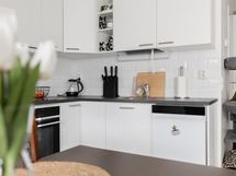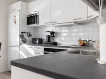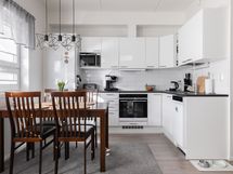 Jääkaappipakastin, induktioliesi, liesituuletin, astianpesukone, kaapistot, kiinteät valaisimet.