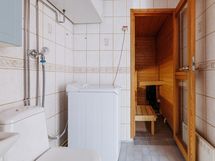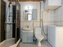 - Pesutilojen varusteet: WC-istuin, suihku, suihkukaappi, lattialämmitys, pesuallas, allaskaappi, peili ja bidee-suihku.