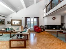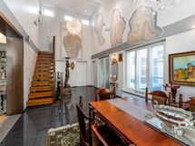 Talon sydämenä toimii yli neljän metrin huonekorkeudella varustettu edustustila, jota koristavat Arvid Bromsin seinäfreskot. Tilat mukautuvat niin arjen hetkiin kuin näyttäviin juhliin: suuri keittiö ja ruokailutilat, kuusi makuuhuonetta (osa hulppean kokoisia), kaksi tunnelmallista takkaa sekä parvi sähkötakkoineen.