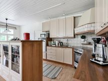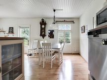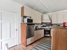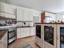 Jääkaappipakastin, pakastekaappi, lattialiesi, liesikupu, astianpesukone, kaapistot, kiinteät valaisimet.
