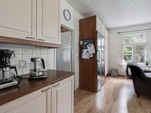 Keittiö: laminaatti, tapetti. Olohuone: laminaatti, tapetti. Makuuhuone 1: laminaatti, tapetti. Kylpyhuone: laattalattia. Eteinen: laattalattia.