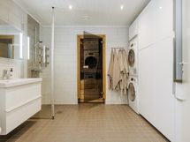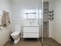 - Varustus: suihkuseinä, pesukoneliitäntä, lattialämmitys, wc-istuin, suihku, kiinteät valaisimet.