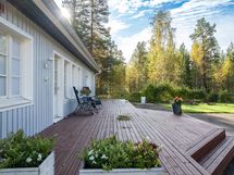 - Takapihalle tilava terassi etelään, johon kulku olohuoneesta ja päätymakkarista. Terassin lisäksi kaksi katettua kuistia.