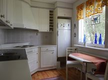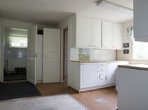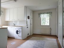 Normaalit kaapistot, liesi, liesituuletin, astianpesukone, mikro, jenkkijääkaappi/pakastin, leivinuuni ja kiertoilmauuni.