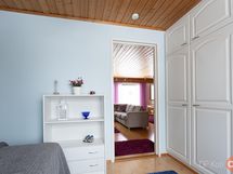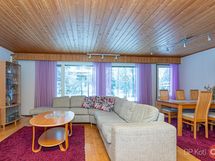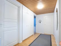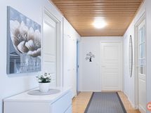 Keittiö: laminaatti. Olohuone: parketti. Makuuhuone 1: laminaatti. Makuuhuone 2: muovi. Makuuhuone 3: parketti. Kodinhoitohuone: laatta. Sauna: laatta. Kylpyhuone: laatoitettu. Eteinen: parketti. Wc: laatta.