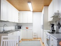 Jääkaappi 2019, pakastekaappi 2019, keraaminen liesi 2019, liesituuletin, astianpesukone 2021, kaapistot 1992, kiinteät valaisimet.