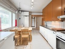 - Jääkaappi, sähköliesi, liesituuletin, astianpesukone, kaapistot, kiinteät valaisimet, pöytätasojen materiaali Laminaatti.