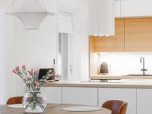 Jääkaappi, pakastekaappi, erillisuuni, induktioliesi, liesituuletin, mikroaaltouuni, astianpesukone, kaapistot, kiinteät valaisimet.