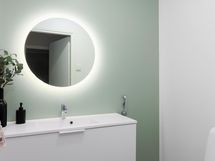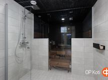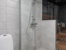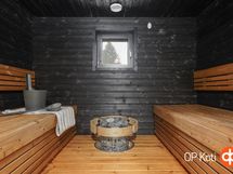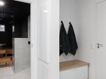 Sauna, sähkökiuas, kylpyhuone, erillinen wc, suihku, peilit, kaapit, allaskaappi, pesukoneliitäntä, lattialämmitys, kiinteät valaisimet.