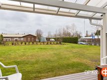 Olohuoneesta avautuu käynti katetulle terassille. Syksyllä voit kääriytyä vilttiin ja nauttia raikkaasta ulkoilmasta vaikka kahvikupposen äärellä.