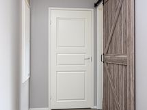 Eteisen lattiassa laatta, seinät maalattu, vaatehuoneen lattiassa vinyyli, seinät maalattu.