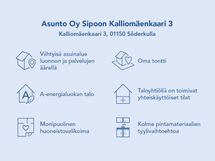Kalliomäenkaari 3:n sijainti on erinomainen lähellä Söderkullan keskusta-alueen palveluita, koulua ja päiväkotia. Alue tarjoaa erinomaiset puitteet urheilun ja ulkoilun ystäville. Upea ympäristö ja laajat viheralueet tuovat luonnon osaksi arkea. Hyvät kulkuyhteydet kruunaavat kokonaisuuden. Porvoonväylä on vain kahden kilometrin päässä, joten liikkuminen sujuu vaivattomasti niin omalla autolla kuin julkisillakin.
