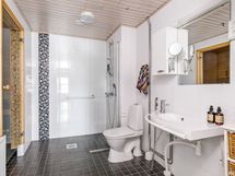 - Pesutilojen varusteet: Suihku, wc-istuin, suihkuseinä, pesukoneliitäntä, pesuallas (huomioitu esteettömyys), bidee-suihku, peili ja tukikaide.