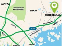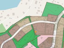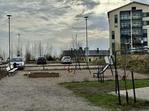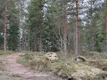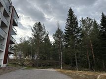 - Puistokäytävä, metsikkö ja kauempana rakennuksia.