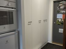 Keittiön kaappien ovet "Puhdas valkoinen maalattu MDF", mustat vetimet, työtaso "Hopea jalava matta laminaatti", välitila "Valkoinen satiini", koneet Electrolux.