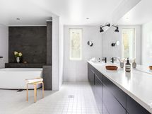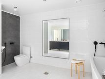 - Pesutilojen kuvaus: Asunnon molemmissa kerroksissa on hyvät peseytymistilat. Yläkerran isossa kylpyhuoneessa on tilat niin ammeelle kuin wc-istuimelle ja pesutornille. Pitkä, yli 4 metrinen allaskaapisto toimii myös kodinhoitotilan työtasona.