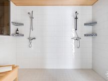 Alakerran saunan yhteydessä on tilava peseytymistila, jossa tuplasuihkut. Lattia ja seinät keraamista laattaa, katto on puupaneelia.