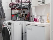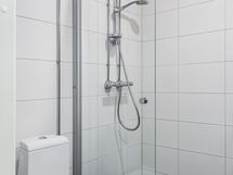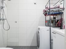 - Kylpyhuone, suihku, suihkuseinä, peilikaappi, pesukoneliitäntä, kiinteät valaisimet.
