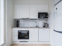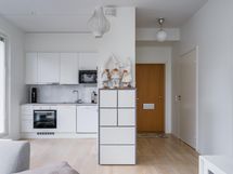 - Jääkaappipakastin, erillisuuni, keraaminen liesi, liesituuletin, astianpesukone, kaapistot.