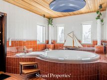 - Pesutilojen kuvaus: Tilava saunaosasto, jossa iso kiinteä poreamme, sauna ja suihku. Käynti ulos.