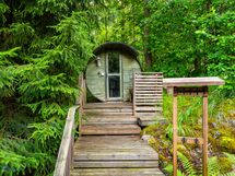- Kuvaus: Erillinen tynnyrisauna pihalla. puukiuas