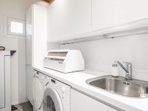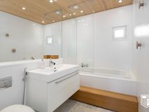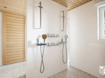 - 1. krs: kylpyhuone/Svedbergin kylpyamme, suihkuseinä, pesuallas, Alessin seinä-wc ja pesuallashana, komposiittitaso, peili. Pyyhekuivain. Seinät ja lattia laattaa.