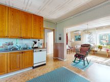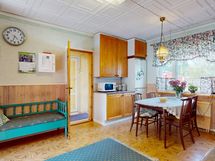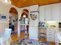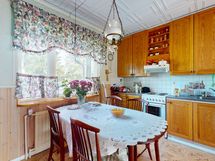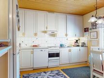 Keittiön varusteet: Liesi, jääkaappipakastin, astianpesukone ja liesituuletin / hormi. Liesi: Sähköhella. Työtason materiaali: Laminaatti.