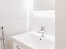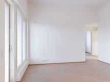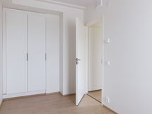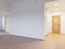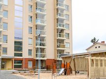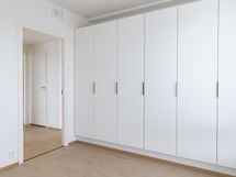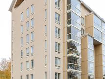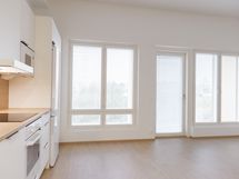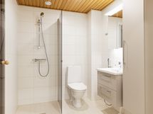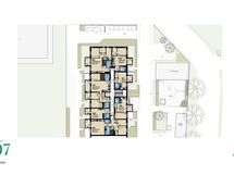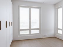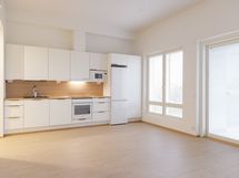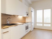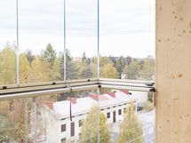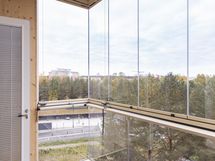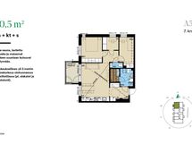 Tämä 7. eli ylimmän kerroksen 70,5- neliöinen kolmio sijaitsee talon kulmassa ja sen lasitettu parveke aukeaa suoraan länteen päin. Ylimmän kerroksen huonekorkeus on normaalia korkeampi, noin 3 m. Moderni avokeittiö sijaitsee olohuoneen yhteydessä ja sen isot ikkunat tekevät asunnosta valoisan. Asumismukavuutta lisää erillinen wc ja toinen löytyy kylpyhuoneen yhteydestä. Asunnossa on tilava sauna, johon mahtuu useampikin löylyttelijä. Vesikiertoinen lattialämmitys maksimoi ikkunapinta-alan tässäkin asunnossa.