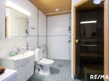 - Pesutilojen varusteet: WC-istuin, peili, suihku, pesukoneliitäntä, allaskaappi ja kiinteät valaisimet. Pesutilojen kuvaus: Wc-istuin kylpyhuoneessa. Erillisten WC:n lukumäärä: 1.