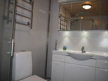 - Suihkukaappi, Pesukonevalmius, Peilikaappi, Allaskaappi, Rättipatteri, Laattalattia, Laattaseinä, Halogeenivalot, Lattialämmitys, Bide