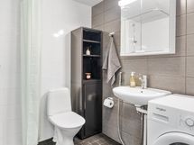 - Wc-kylpyhuoneessa suihku, peilikaappi, pesuallas, pesukoneliitäntä, suihkuverhokisko, lattialämmitys sähkövastuksin. Kokonaan laatoitettu.