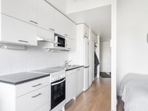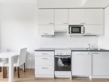 - Jääkaappi/pakastin, keraaminen liesi, liesikupu, astianpesukone, kaapistot, työpöytätasot laminaattia, tiskipöytälevy kuviopintainen RST-levy