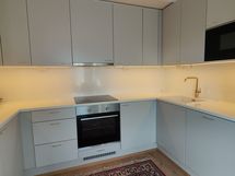 Tilaa isolle ruokapöydälle, Paljon kaappitilaa, Paljon työskentelytilaa, Laminaattitasot, Integroidut koneet, Liesituuletin, Induktioliesi, Jääkaappi, Pakastin