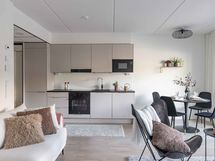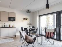 Eteisestä käydään avaraan olohuoneeseen, johon keittotila avautuu. Tilavassa makuuhuoneessa on paikka työpisteelle, ja lisäksi vaatehuone. Asunnossa on suuret lattiataso-ikkunat ja lattialämmitys. Kylpyhuoneen jatkona ikioma sauna. Ikkunat ja suuri parveke sekä oma asuntopiha avautuvat kohti korttelin piha-aluetta.