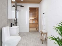 Keraaminen laatta seinissä ja lattiassa, katossa lämpömäntypaneeli ja kattoon upotetut led-valaisimet. Puustellin peili- ja allaskalusteet.