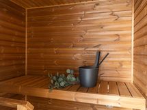 Seinässä ja katossa lämpömäntypaneeli, lattiassa keraaminen laatta. Lauteet lämpömäntyä. Valaisin alalauteen alla. Kiuas, kirkas lasiovi jossa puinen nuppivedin.