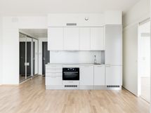 Keittiön kiintokalusteet ja kodinkoneet asunnosta riippuen ja pohjapiirustuksen mukaisesti: 2- tai 4-liesinen induktiotaso, integroitava kalustepeitteinen jääkaappi pakastinlokerolla tai integroitava jääkaappipakastin tai erilliset integroidut jääkaappi ja pakastin, integroitava kalustepeitteinen pienempikokoinen astianpesukone tai integroitava astianpesukone 45 cm tai 60 cm, kompakti kalusteuuni, jossa monitoimiuuni ja mikroaaltouuni samassa tai kalusteuuni ja integroitu mikroaaltouuni, aktiivihiilisuodattimella varustettu liesituuletin. Asunnoissa B105 ja B116 on liesitasoon integroitu liesituuletin. Keittiöissä on 1-altainen tasoon upotettu pesuallas. Altaan leveys ja materiaali vaihtelevat asunnosta riippuen pohjapiirustuksen mukaisesti. Kompaktikeittiössä RST-allas, muissa keittiöissä komposiittiallas. Keittiön kalustevälissä välitilalevy tai -lasi huoneiston tasoluokituksen ja materiaalisesitteen mukaisesti.