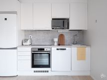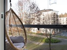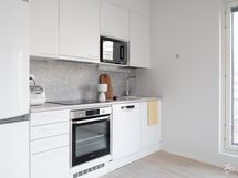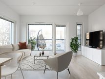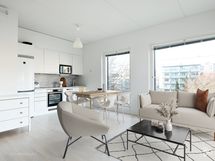 Keittiö ja olohuone ovat yhtenäistä, kodikasta tilaa. Keittiön varusteina on jääkaappi/pakastin, astianpesukone, erillisuuni, induktiokeittotaso ja liesituuletin. Avara oleskelutila on sisustettavissa monella tapaa. Koko asunnon levyinen lasitettu parveke antaa viihtyisää lisätilaa aikaisesta keväästä myöhäiseen syksyyn.
