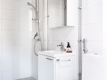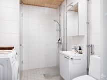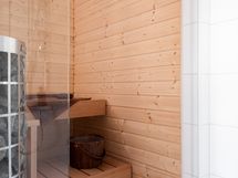Kodissa on oma pieni sauna, joka yhdistyy kylpyhuoneeseen lasiseinällä tehden tiloista avaran tuntuiset. Kylpyhuoneessa suihku, allas- ja peilikaappi, wc-istuin, pyykkikomero ja tilavaraus pyykinpesukoneelle/pesutornille. Kylpytilojen lisäksi koko kodissa on miellyttävä lattialämmitys. Vaalean sävyisen, hyvin pidetyn kodin seinät ovat maalatut ja lattiamateriaalina on valkokuullotettu tammiparketti.